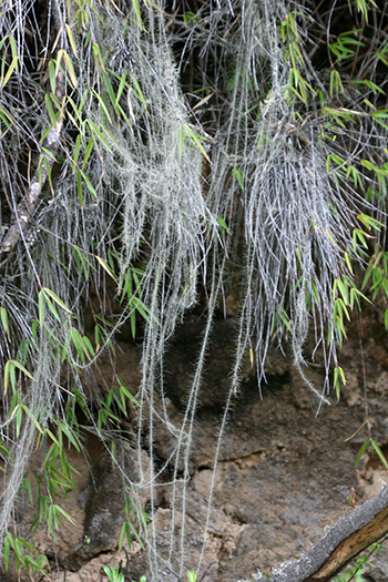 樹木からモジャモジャと垂れ下がるように生えるサルオガセ(図18-4a)もまた地衣類です。ところがアメリカにはこれとよく似たサルオガセモドキ(図18-4b)がありますが、こちらは被子植物門・単子葉植物パイナップル科の植物なのです。これも収斂進化ですね。