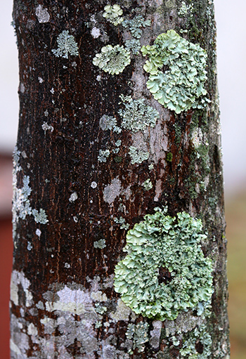 菌類のなかで重要なグループがもう1つあります。「地衣類」と呼ばれるものです。地衣類も菌類の仲間ですが、緑藻やシアノバクテリアなどの藻類との共生体です。菌類が藻類に生活の場と水や無機物を与え、代わりに藻類が光合成で作る栄養を得ているのです。地衣類は僕たちのまわりでもよく見かけます。図18-3aのように樹の幹や図18-3bのように石の表面にも生えます。