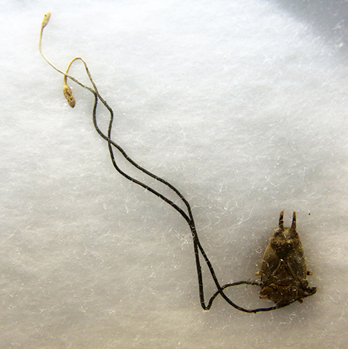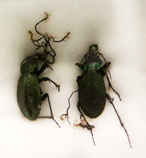 冬虫夏草は、取りついた虫を殺し、その死体から生えてくるキノコです。漢方薬に使われる冬虫夏草は、チベットなど標高4,000メートル付近の草原に生息するコウモリガの幼虫に寄生する菌です。また漢方薬には使われませんが、冬虫夏草の仲間でカメムシタケ(図18-2a)、オサムシタケ(図18-2b)と呼ばれるものがありますが、それぞれカメムシ、オサムシに寄生する子嚢菌です。