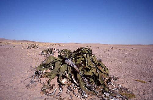 イチョウとグネツムはかつてとても繁栄したグループでしたが、現在ではイチョウ綱はたった1種、グネツム綱は、緑色植物の系統樹マンダラ(図19-2)に出てくる3属しか残っていません。そのなかでもウェルウィッチア属にはサバクオモト1種(図19-3)だけで、分布も南部アフリカのナミブ砂漠に限られています。