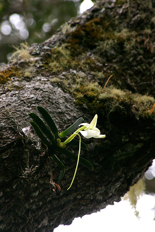 アングレーカム・セキスペダレ(図19-4)というランはマダガスカルのものです。この花には「距(きょ)」と呼ばれる長い管がついていて、その先に蜜がたまるようになっています。19世紀に園芸植物としてイギリスに入ってきたこの花を見たダーウィンは、この花の蜜を吸うことができ、花粉を別の花に運ぶガがいるはずだと考えました。この花の蜜を吸うためにはとても長い口吻(ストロー)が必要ですが、当時の昆虫学者はそんなガがいるはずはないと、ダーウィンの考えを嘲笑いました。ところがダーウィンが亡くなったあとで、マダガスカルでそのようなキサントパンスズメガ(図19-5)が発見されたのでした。