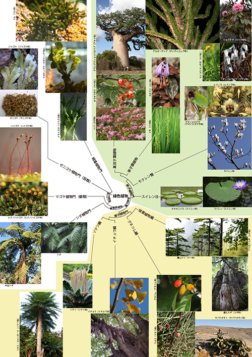 ここでは、このなかの緑色植物の進化を見ていきましょう。もともと動物も植物も海の中で進化したのですが、植物のなかで陸上にも進出して一番繁栄しているのが緑色植物です。