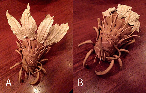 コシミノダニ(ヤギの皮)。威嚇モード(A)、通常モード(B)。あまのじゃくとへそまがり氏の作品。