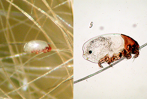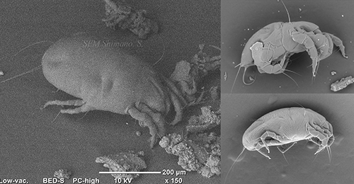 住宅にいるダニたち。コナヒョウヒダニ Dermatophagoides farinaeは、その第I脚が太いのが雄で、雌は細い。性的二型がある(撮影:島野智之)。