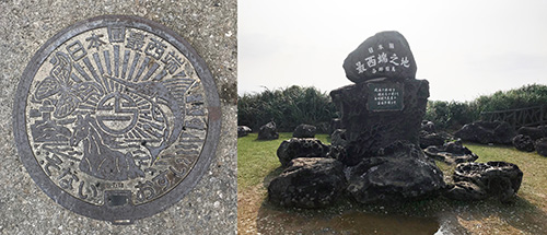 与那国島のマンホールの蓋と日本最西端の碑。マンホールにデザインされているのは、日本最大のガであるヨナグニサン(アヤミハビル)、日本在来馬の与那国馬(与那国町の天然記念物)、そして水揚げの多いカジキマグロ。