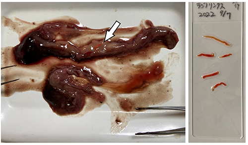 ラジノリンクスはオレンジ色の寄生虫で、サンマの消化管内に寄生する。大きさはおよそ1~3cm程度で、サンマへの病害性はほとんどないとみられる。ちなみに人に寄生するような寄生虫ではなく、私たちがこのラジノリンクスを食べても問題はない。
