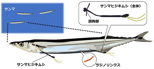 ちなみに、サンマにくっついているのは全て雌となる。サンマヒジキムシの仲間であるヒジキムシの仲間は、交尾をした後で雌が宿主に取り付いて頭を突っ込み大きく成長し、卵を作る。生活史には謎が多く、サンマにたどり着く前に別の宿主(イカタコの仲間の可能性がある)に付いているはずなのだが、実際に何に付くのか、よくわかっていない。