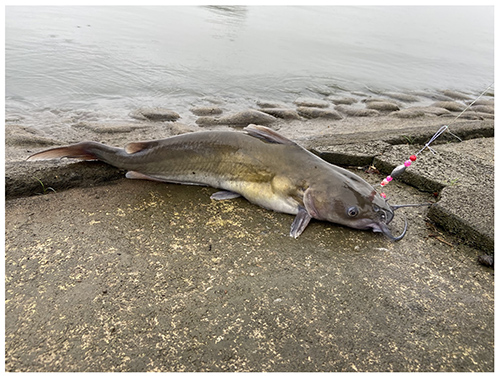 このチャネルキャットフィッシュは「釣り針+おもり+リール」のごく簡単な仕掛けで釣れるので、2021年に釣りを始めた僕のようなビギナーでも結構釣れる。釣り餌は動物質なら何でも良いが、においがあり酒の肴になるようなものが特に良い。僕は「サバの切り身」信者なので専らこれを使用するが、人によっては「イカの切り身派」「イカの塩辛派」「専用の市販の釣り餌派」「魚肉ソーセージ派」などの様々な流派に分かれ混迷を極めている。