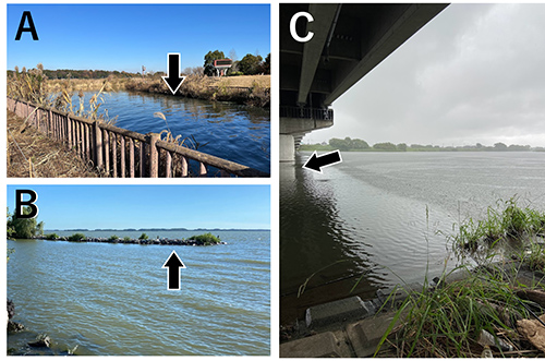 図2.チャネルキャットフィッシュのいそうな”におい”のする場所(実際に釣れたかどうかは別)。A:草が茂って水面の影になっているところ(矢印)。B:堤防や石積みの周辺(矢印)。C:橋の真下の影になっているところや、橋脚の根元(矢印)。