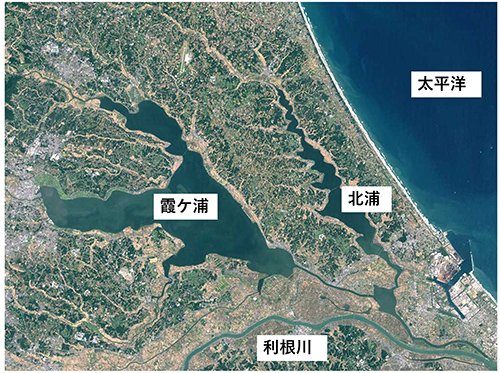 図3.茨城県に位置する霞ケ浦とその周辺地図。霞ケ浦とその隣の湖・北浦から水が利根川に合流し、銚子へと流れやがて太平洋にそそぎ込む。