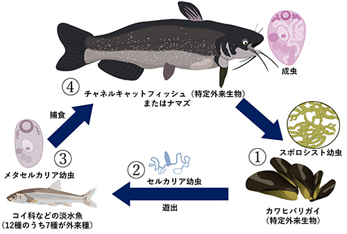 チャネルキャットフィッシュや日本のナマズに寄生した成虫は、宿主の腸で産卵し、その卵は宿主の糞と共に水中へ放出される(ナマズよりチャネルキャットフィッシュの方が圧倒的に個体数が多く、成虫の主な宿主はこちらと考えるべきだろう)。それがカワヒバリガイという二枚貝に取り込まれ、スポロシストという幼虫になる(①)。スポロシストからは、セルカリアという幼虫が大量に生み出されて水中に出る(②)。水中のセルカリア幼虫は、ウグイをはじめとした日本在来の小魚や、タイリクバラタナゴなどの外来種の小魚に感染し(③)、その体内で次のステージのメタセルカリアという幼虫になる。この幼虫が感染魚とともにチャネルキャットフィッシュやナマズに食べられると成虫になる(④)。br>