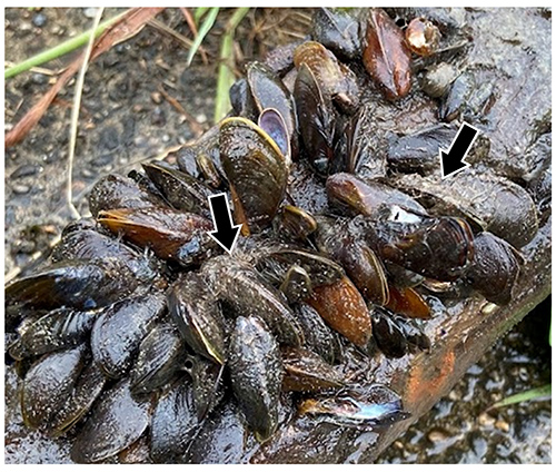 図5.東アジア原産の淡水二枚貝カワヒバリガイ。写真のように、たくさんの個体が何かしらの構造物にくっついて生活する(写真では、水中の木の枝にくっついていた)。毛のような足糸(矢印のもさもさしたもの)でくっつくが、集団で付着されると掃除がとても大変だ。この貝もチャネルキャットフィッシュと同様に特定外来生物に指定されている。