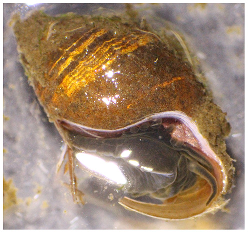 図1. サカマキガイ。殻サイズは1cmもない小型の淡水巻貝だ。水草などに紛れて水槽に入り込んでくるので、あなたの部屋の水槽にもいるかもしれない。逆巻き(さかまき)の名の通り、殻の巻きが左巻き(殻の口が向かって左側にある)なのが特徴だ(写真:安齋榮里子)。