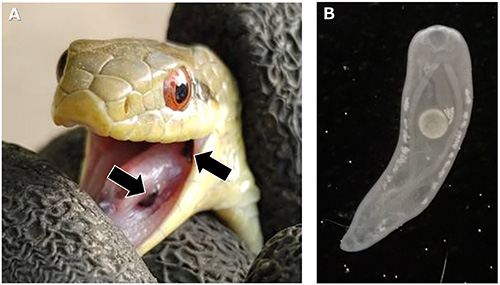 図2 A. シマヘビの口の中に寄生したヘビクチグロ吸虫(矢印)の成虫。B.ヘビクチグロ吸虫の顕微鏡写真。体長は数mmもない程度の小さな吸虫だ(写真:瀬尾栄滋)。