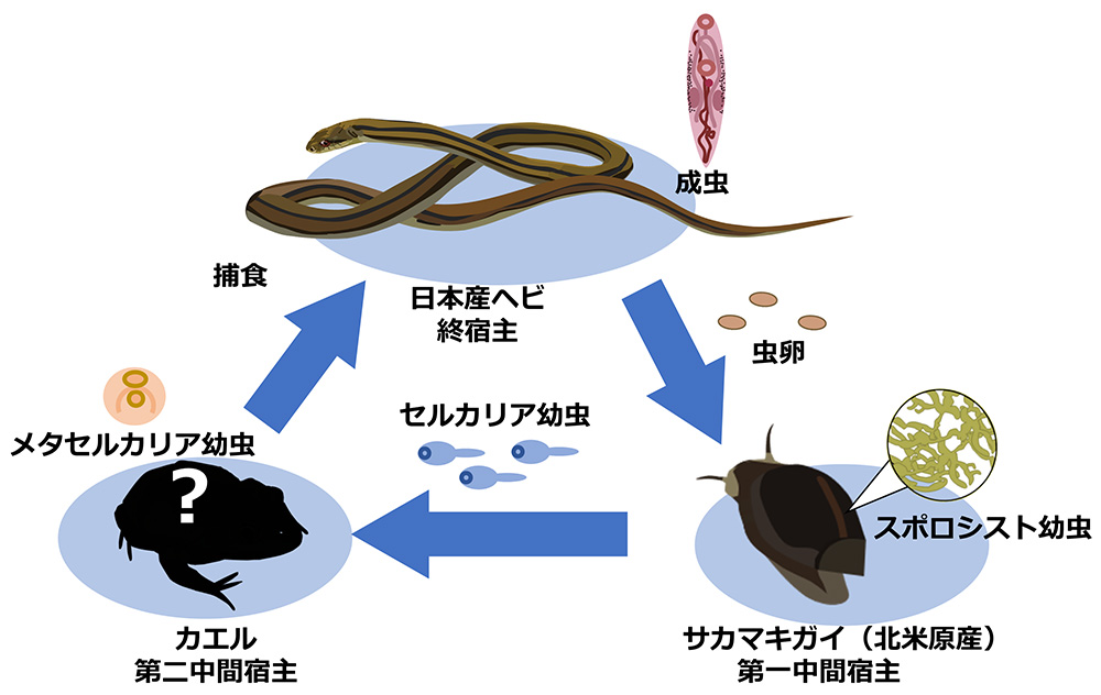 北米では、ヘビに寄生した虫卵が淡水の貝に寄生して、そこからカエルに感染がまわって、そのカエルを食べたヘビが感染する。そこで、日本のいろいろな貝やカエルにこの吸虫の幼虫がついてないか調べていった。今のところは日本にいるカエルから幼虫が見つかっていないが、関東に侵入したサカマキガイからは、この吸虫の幼虫が発見されている。