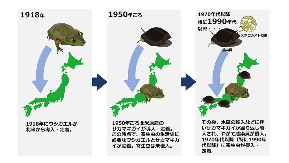 図7. 北米原産の外来寄生虫「ウシガエル斜睾吸虫」の、本研究で推定された日本への導入経緯。日本では、1918年にウシガエルが北米から持ち込まれた。サカマキガイは、1950年ごろ日本に定着し始めたと考えられる。サカマキガイは水草の輸入に付随して繰り返し日本国内に侵入していたが、おそらく1990年代以降の観賞魚ブームの時に、感染サカマキガイが日本に侵入し、野外のウシガエルとサカマキガイを利用して日本に定着したのではないだろうか(イラスト:脇 司)。
