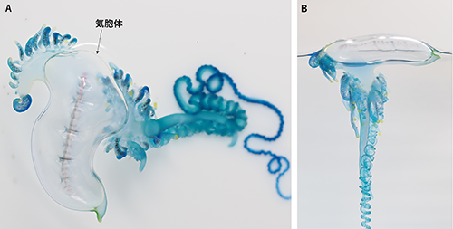 図1. カツオノエボシ。A. 海水に浮かべて上から撮影したところ。B. 横からみたカツオノエボシ。図鑑でよく見かけるアングルはこちら(写真提供:関根百悠)。