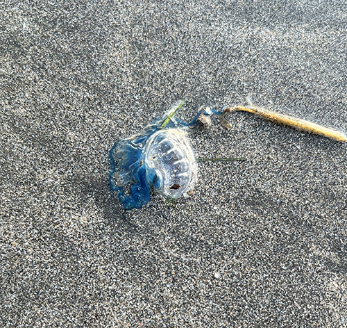 図2. 海風に乗って海岸まで吹き寄せられ、そのまま打ちあがってしまったカツオノエボシ。まだ生きていて、つつくと触手を縮めたりして反応する。