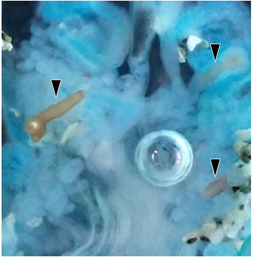 図3. 解剖中のカツオノエボシ(顕微鏡で覗いたところ)。クラゲビードロ吸虫(3虫体、矢頭)。メタセルカリアと呼ばれる、成虫のひとつ前の成長段階だ。