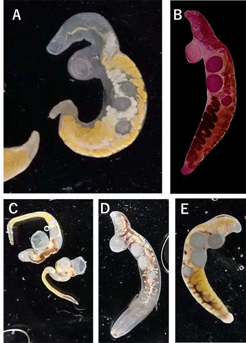 図3. マンボウとヤリマンボウから見出された様々な吸虫。A:マンボウリュウグウキュウチュウ(既知種)Accacoelium contortum。B:ダイオウマンボウキュウチュウ(既知種、染色した標本)Accacladocoelium nigroflavum。C: オドネルマンボウキュウチュウ(既知種)Odhnerium calyptrocotyle。D, E:ベンガラマンボウキュウチュウ(新種)Accacladocoelium mayosenase。