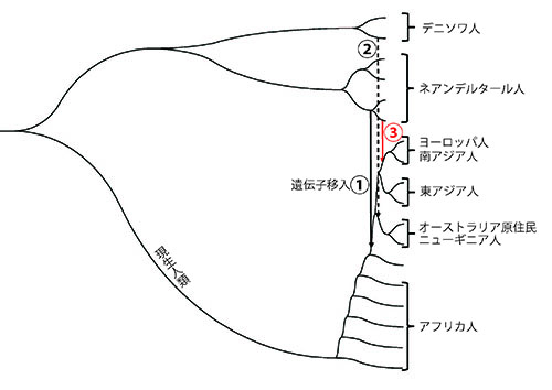 4万5000年前のシベリアで生きていた現生人類のゲノムを調べてみると、ネアンデルタール人由来のDNAが現代の非アフリカ人のものよりも7倍も長いという。つまり、この個体が生きていたのはネアンデルタール人との交雑から間もない頃であり、現代の非アフリカ人ではその後組換えが度重なったために、ネアンデルタール人由来のDNAが短くなったものと考えられる。非アフリカ人のすべてがネアンデルタール人由来のDNAをもっているわけではなく、遺伝子移入①が起こる前に分かれた系統もあるので、それとの交雑でネアンデルタール人由来のDNAは次第に薄まったのである。
