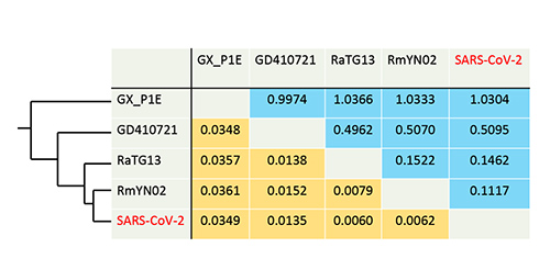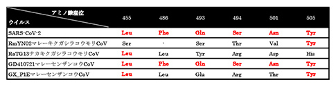 一方、スパイクたんぱく質の受容体結合領域に関しては、SARS-CoV-2に一番近縁なのはマレーセンザンコウのGD410721になる。特に受容体との結合に際して重要と考えられる6カ所のアミノ酸座位がこの2つのウイルスで完全に一致するのに対して、マレーキクガシラコウモリのウイルスでは6つのアミノ酸のうちの5カ所が違っている(表4-1)。