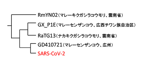 これまでに知られているウイルスの中でSARS-CoV-2に一番近縁なのは、スパイクたんぱく質遺伝子以外のゲノム領域ではマレーキクガシラコウモリのRmYN02であるが、RmYN02のスパイクたんぱく質の受容体結合領域はSARS-CoV-2のものとは系統的に非常に離れている(図4-4)。