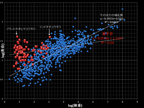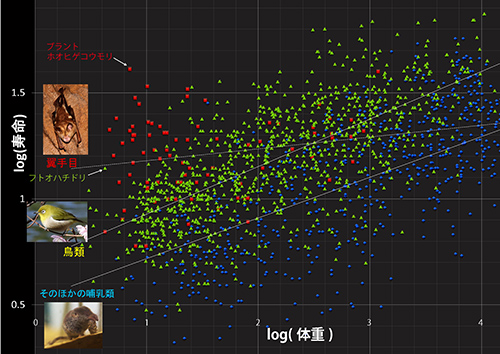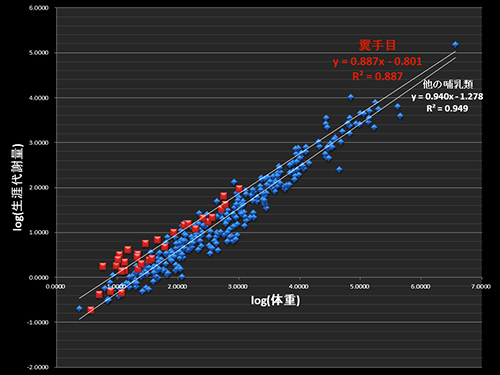 翼手目とそのほかの哺乳類それぞれできれいな相関関係が見られるが、翼手目の回帰直線はほかの哺乳類の回帰直線よりも明らかに上になる。コウモリは同じ体重のほかの哺乳類にくらべて生涯代謝量が多いのである。