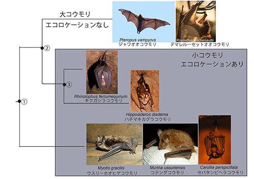長い間、小コウモリと大コウモリという2大分類は、系統関係を反映するものと考えられてきたが、図14-1が示すように、分子系統学により同じ小コウモリでもキクガシラコウモリやカグラコウモリは、ホオヒゲコウモリ、テングコウモリ、ヘラコウモリなどよりもオオコウモリに近縁だということが明らかになってきた。
