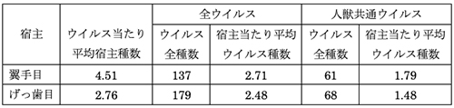 またコウモリの場合、一つの洞窟をねぐらとするのが一種だけではなく、いろいろな種類のコウモリが一緒に利用することが多い。そのために異種間での感染も起こりやすく、ウイルス当たりの平均宿主の種数がげっ歯目にくらべて翼手目が圧倒的に多くなっているものと思われる(表14-1)。