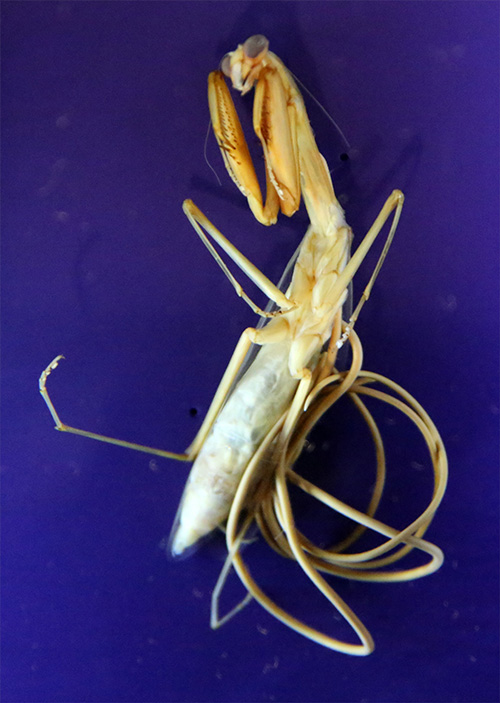 カゲロウやユスリカは成虫になると、陸に飛び立っていくが、ハリガネムシのシストをもった成虫はカマキリなどに食べられる。ハリガネムシはカマキリの体内で大きく成長するが、ハリガネムシはこのままでは繁殖できない。彼らは水中でしか繁殖できないのである。