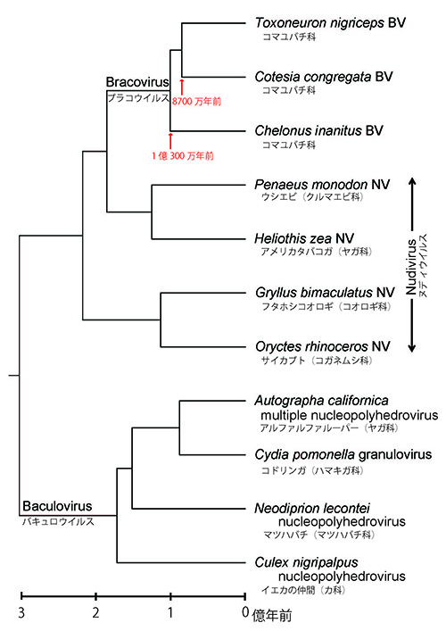 ポリドナウイルスの二大グループの一つであるブラコウイルスは、およそ1億年前にバキュロウイルスの姉妹群であるヌディウイルスの一つの系統がコマユバチ科の祖先のゲノムに内在化することによって生まれたと考えられる(図16-2)(3)。