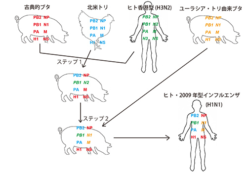 まず3種類のインフルエンザウイルスが登場する。1つは、スペイン風邪ウイルスがブタに感染してその後も受け継がれているもので、「古典的ブタウイルス」と呼ばれている。2つ目は北米の鳥がもっていたウイルスで、3つ目が1968年に香港風邪を引き起こしたヒトのH3N2亜型インフルエンザウイルスに由来する季節性インフルエンザウイルスである。