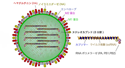 アメリカのセント・ジュード小児研究病院のロバート・ウェブスターは、長年にわたって野生の鳥類からインフルエンザウイルスを採取してきた(5)。A型インフルエンザウイルスのヘマグルチニン(HA) とノイラミニダーゼ(NA)には、それぞれ16種類と9種類の亜型があるが、それらはすべてカモなどの水鳥でみつかっている。水鳥ではインフルエンザウイルスは主に腸管で増殖し、糞便とともに水中に排泄され、その水を飲むほかの鳥に伝搬される。