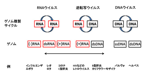 また一本鎖RNAウイルスでも、ゲノムがそのまま伝令RNAになるプラス鎖一本鎖RNAウイルスと、ゲノムが一度転写されてはじめて伝令RNAになるマイナス鎖一本鎖RNAウイルスとがある。