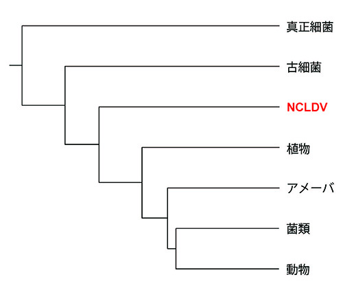 NCLDVは本当に系統的に一つのグループを作っているのだろうか。個々の遺伝子は水平伝搬によって細胞性生物とウイルスの間やウイルス同士で交換されることがあるので、個々の遺伝子の系統樹解析だけではこの問題を解明することはできない。