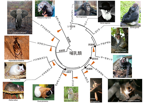 ボルナウイルスは細胞核で複製を行なうが、そのゲノムはおよそ8900塩基のRNAであり、6つの遺伝子をコードしている。そのうちの一つがN遺伝子でNたんぱく質というカプシドたんぱく質をコードしている。このN遺伝子がヒトのゲノムに組み込まれて内在化しているのである。そのような内在化は、図25-1で示すようにヒト以外のさまざまな哺乳類でも見られるが、哺乳類の多くの系統でそれぞれ独立に起こっているのである。ヒトの内在性ウイルス配列はマーモセットなど新世界ザルでも見られるので、真猿類の共通祖先で内在化が起こったと考えられる。