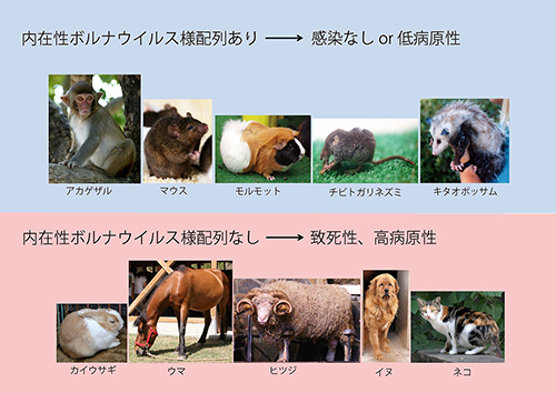 内在性配列をもつ動物ではボルナウイルスに感染しにくいか、あるいは感染しても軽症ですむのに対して、そのような配列をもたない動物では、重篤な症状に陥る傾向があるという(図25-2)(9)。進化の過程でボルナウイルスに遭遇した系統ではウイルスに対する対処法が進化したが、最近までそのようなウイルスに出会ったことのなかった系統では進化する機会がなかったということかもしれない。