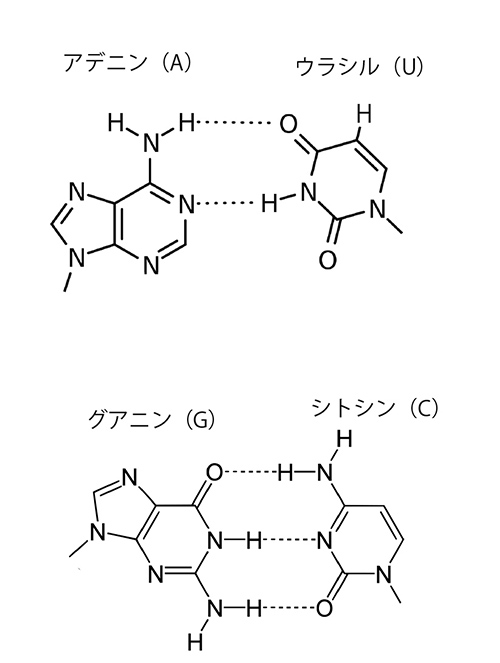 DNAは二本の鎖が相補的な塩基結合対で結ばれて安定した構造を保っている。一方、MS2ファージのゲノムはプラス鎖一本鎖RNAだから、塩基結合対が一本の鎖のなかでできてしまう。つまり一本の鎖のなかで、アデニン(A)とウラシル(U)、グアニン(G)とシトシン(C)の間で相補的な塩基結合対ができる(図30-3)。連続した塩基結合対が並んだ領域をステム、対ができない領域をループという(図30-4)。塩基の並び方を一次構造というが、ステムやループなど塩基対形成の有無を二次構造という。二次構造をもったRNA分子がさらに折りたたまれて立体的な三次構造を作るのである。